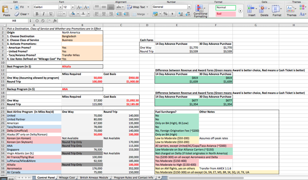 The calculator also caters to people who place a monetary value on their AMEX or Chase points or have a lot of frequent flyer miles through flying or manufactured spend, since they can compare the cost of a ticket on each program with a sample “low” and “regular” business class fare to the same region. It’s often hundreds of dollars cheaper to buy miles outright and redeem, and this tells you how.