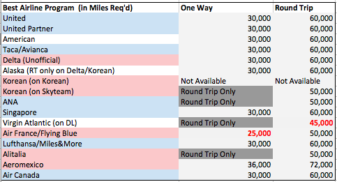 This tool looks at 14 different frequent flyer award charts to determine the cheapest way to get from North America to anywhere in the world, one way or round trip, in Economy, Business and First Class.
